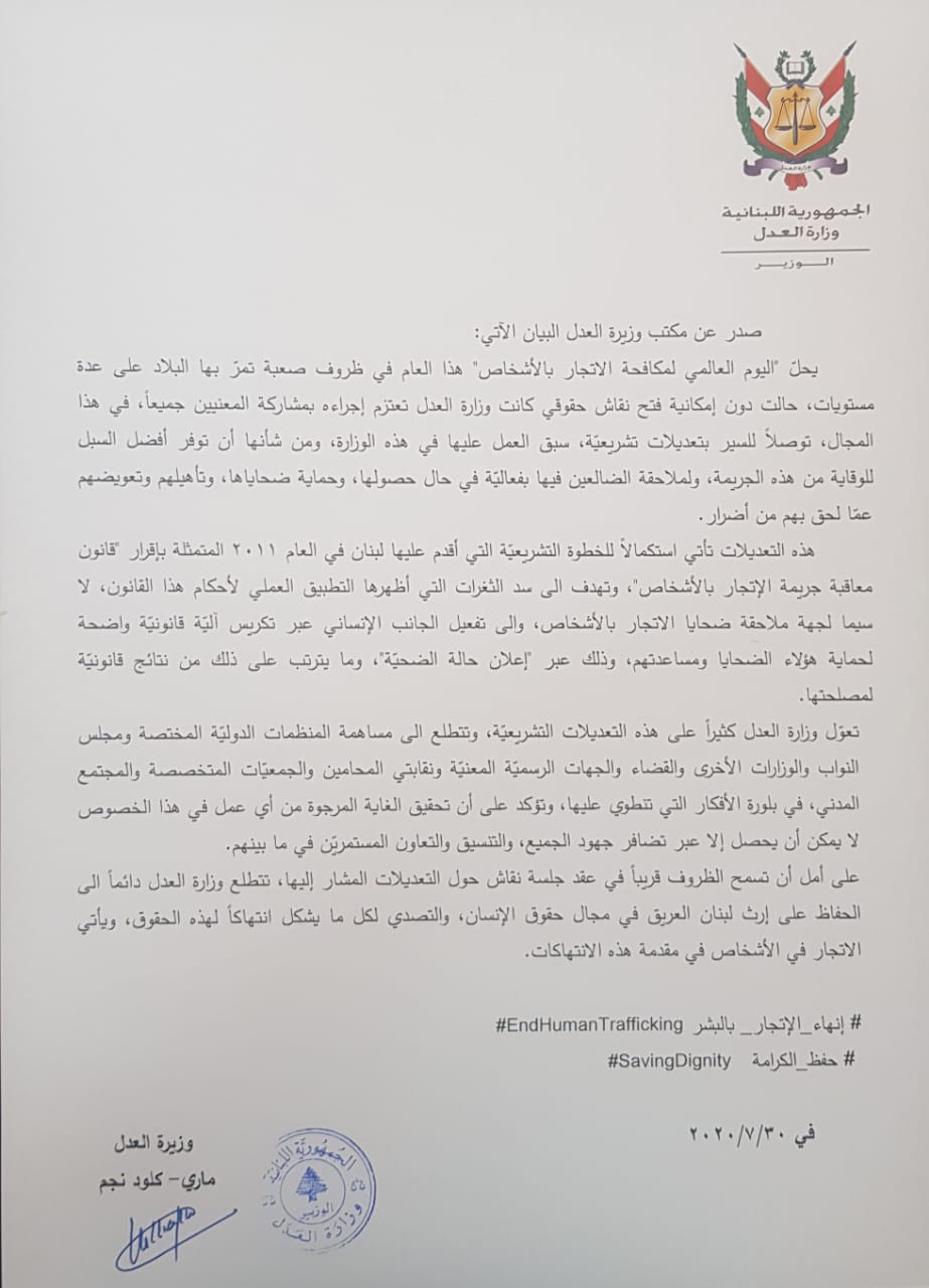 "يحل اليوم العالمي لمكافحة الإتجار بالأشخاص هذا العام في ظروف صعبة تجتازها البلاد على مستويات عدة، حالت دون إمكان فتح نقاش حقوقي كانت وزارة العدل تعتزم إجراءه بمشاركة المعنيين جميعا في هذا المجال، توصلا للسير بتعديلات تشريعية سبق العمل عليها في هذه الوزارة، ومن شأنها أن توفر أفضل السبل للوقاية من هذه الجريمة، ولملاحقة الضالعين فيها بفعالية في حال حصولها، وحماية ضحاياها، وتأهيلهم وتعويضهم عما لحق بهم من أضرار.