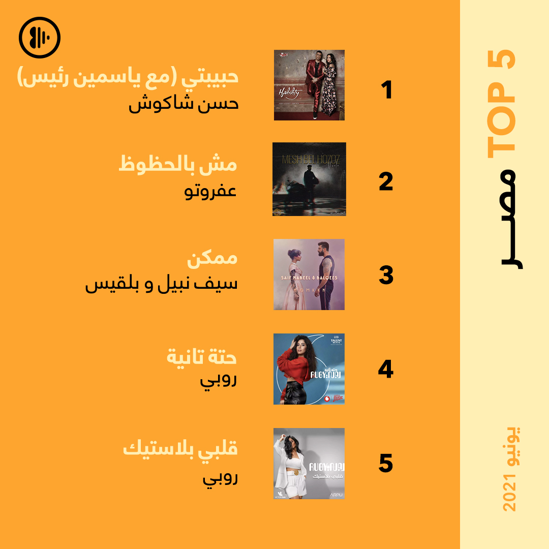 منصة أنغامي نشرت مساء أمس القائمة النهائية للأغنيات الأكثر استماعا في شهر يونيو 2021، في مصر ولبنان والسعودية والعراق، وتصدرت اغنية حبيبتي لـ حسن شاكوش وياسمين رئيس قائمة الأكثر استماعا فى مصر حيث احتلت المركز الأول واحتل عفروتو المرتبة الثانية بتراك "مش بالحظوظ".