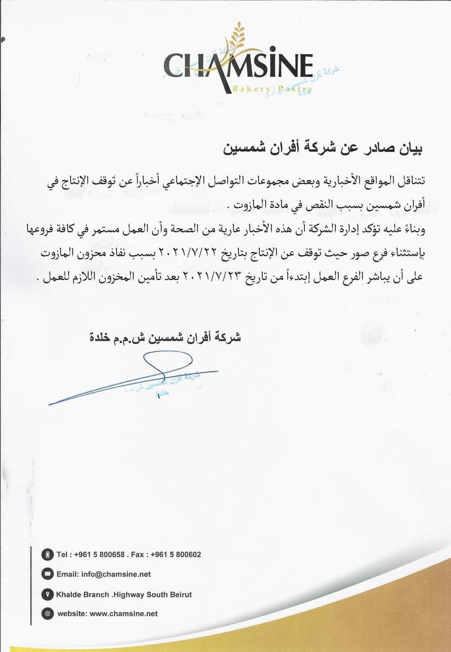 انتشرت عبر وسائل التواصل الإجتماعي قبل الظهر صورة نُسِبت إلى أفران شمسين، تضمنّت “اعتذار الأفران بكافة فروعها من زبائنها، وأنها لن تستطيع تقديم مادة الخبز بكافة أنواعه حتى إشعار آخر بسبب عدم توفر مادة المازوت”.
