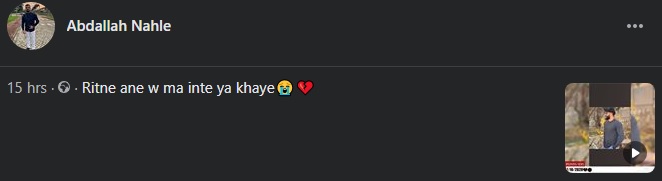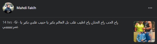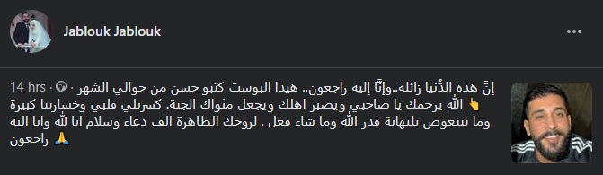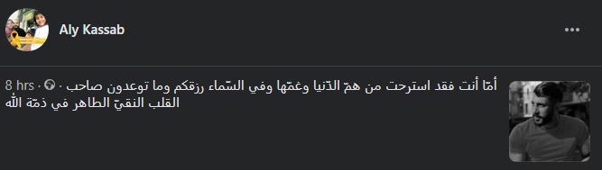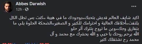 وقد أخبره أحد الأصدقاء علّه يسمعه، فقال " الكبير والصغير عم يحكي فيك ، راحت الضحكة الحلوة والقلب الطيّب والحنون ، كنت تحب الناس والناس تحبك، كنت تركض أول واحد لتساعد الناس ، كان قلبك نضيف ، وروحك طيبة ، صدمتنا كلنا ، صدمت كل لبحبوك ، فجعت قلوبنا.. لح نفقدلك كتير.. يا عمري.. يا زينة شباب بير العبد".
