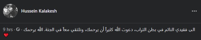 "الى فقيدي النائم في بطن التراب، دعوت الله كثيراً أن يرحمك، ونلتقي معاً في الجنة"..