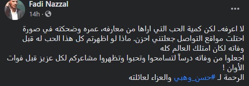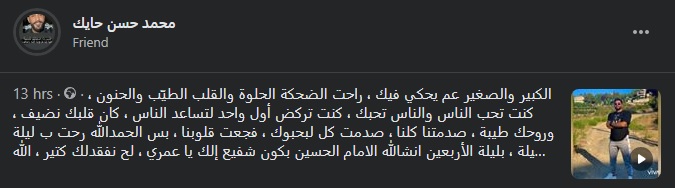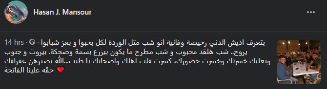 حسن "الحنون" كما وصّفه أصحابه، أحدث صدمة أليمة برحيله، فضجّت كل مواقع التواصل الإجتماعي بصوره وبعبارات مؤثرة، والملفت كان عدد أصدقائه الكبير والمشاعر الحزينة التي عبّروا عنها على صفحاتهم. حتى من لا يعرفه رثاه بطريقة لافتة لما شكّله رحيل هذا الشاب من أثر في نفوس الجميع حتى تحوّل الفيسبوك وكأنه "عزاء".